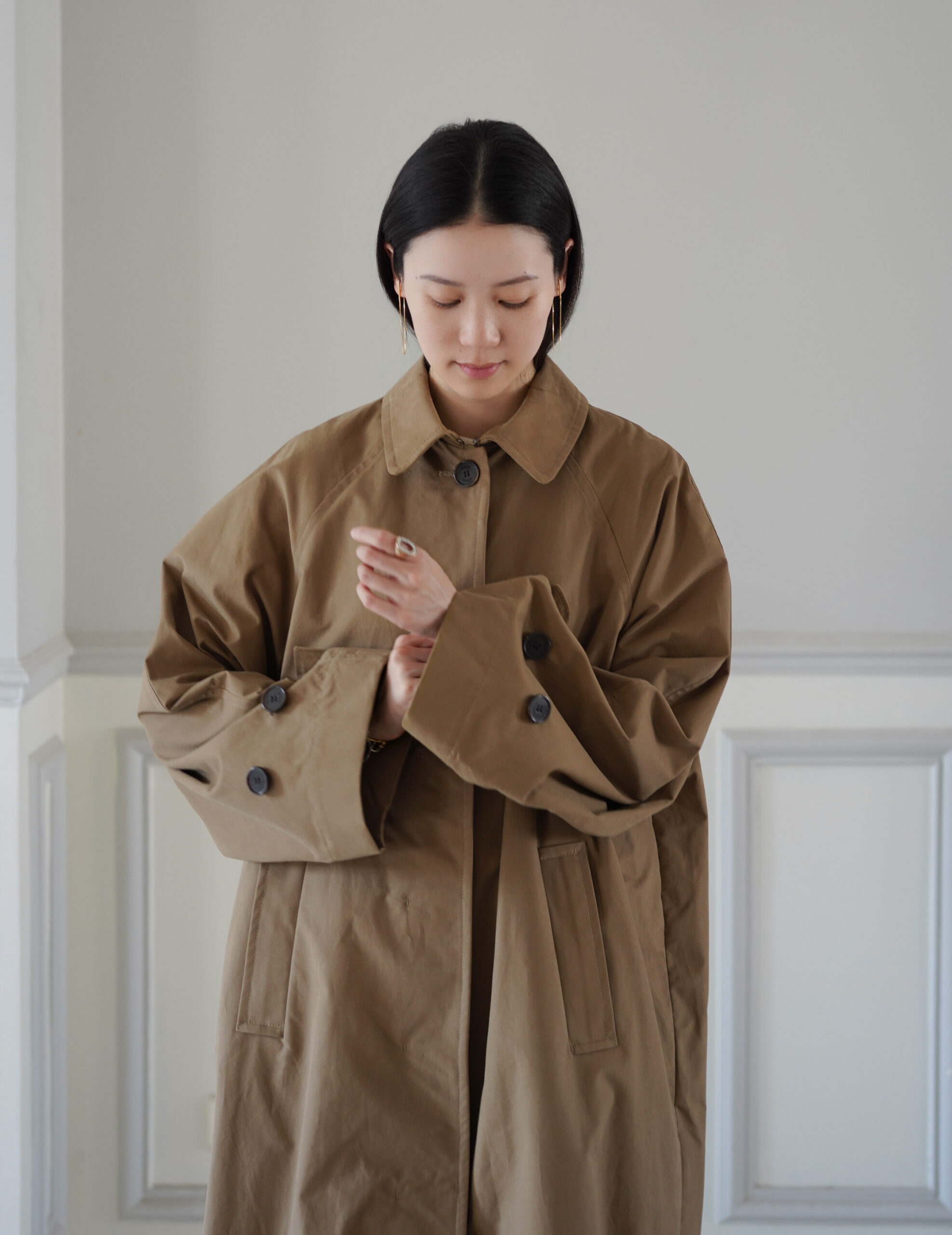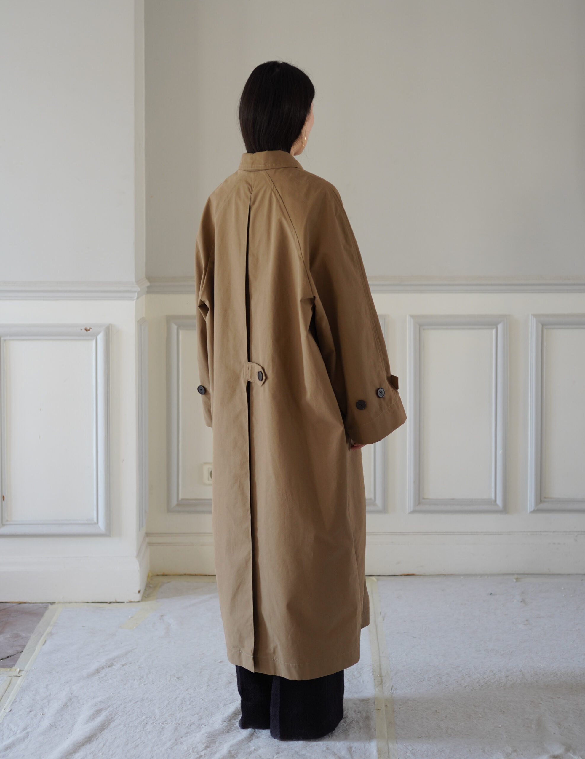 With raglan sleeves for comfort and a hidden button closure for a clean look, the coat features a loose, longline fit that falls to mid-calf, balancing elegance with effortless wearability. The Drabe camel-brown tone adds understated sophistication, making it a versatile piece for both everyday and formal occasions.