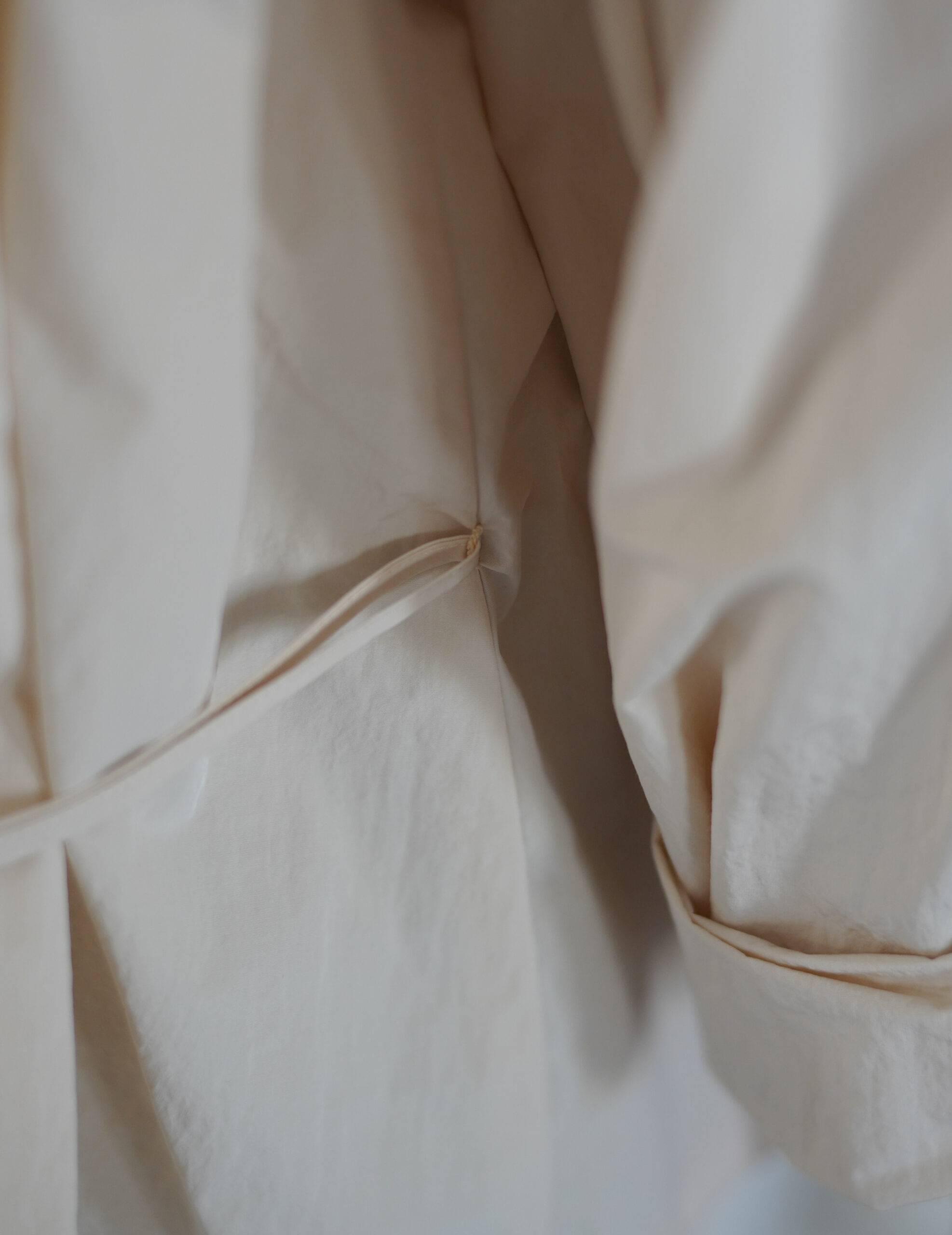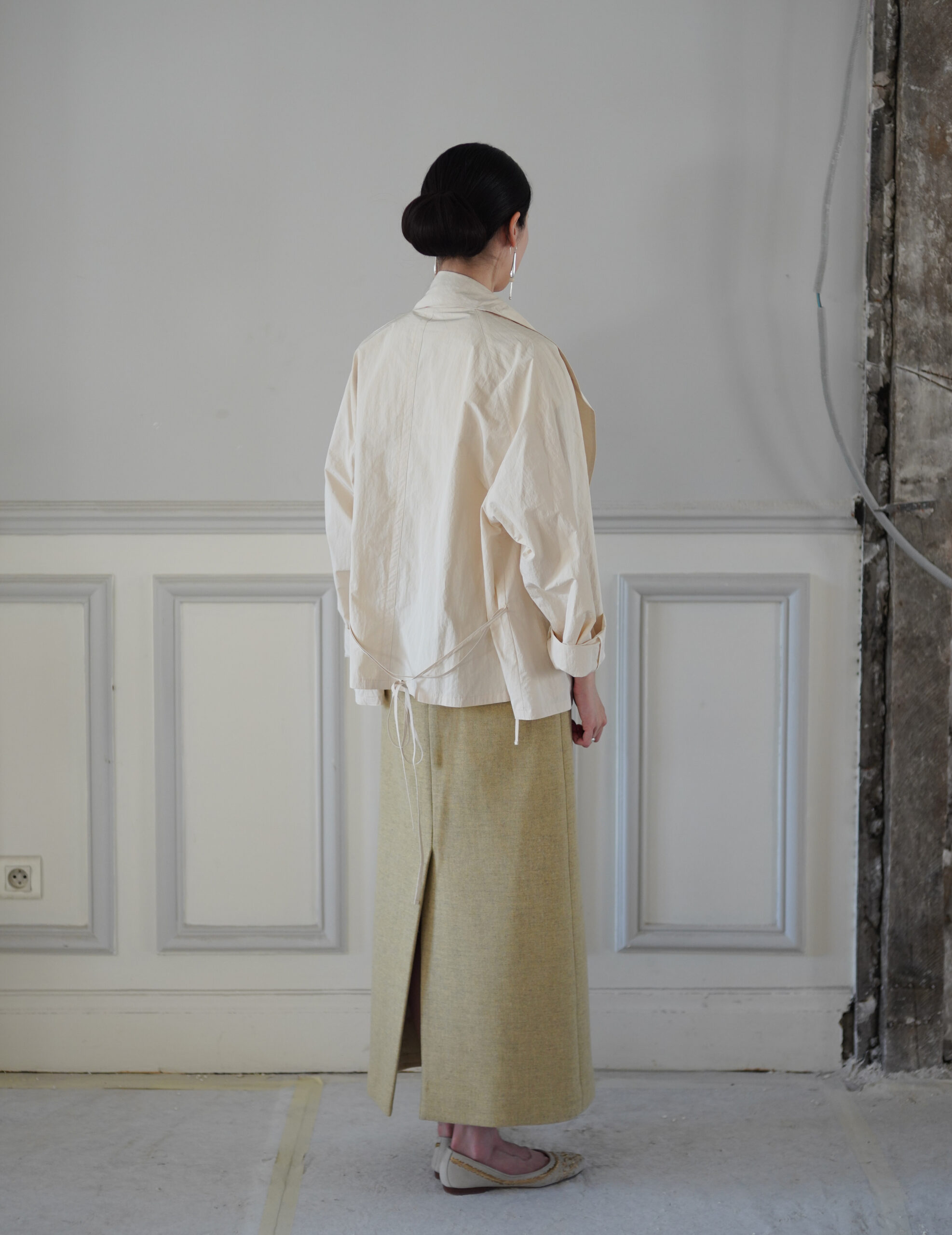 From South Korean brand LE17SEPTEMBRE, the Scarf Short Trench Jacket is crafted from crinkled cotton- and polyester-blend taffeta, offering a lightweight yet structured feel. The shawl collar integrates an attached scarf with a cutout detail, striking a balance between elegance and modern minimalism. Designed with a wrap front, it features belt loops and a matching self-tie belt for adjustable styling. Raglan sleeves create a smooth shoulder line and ease of movement, while the unlined construction makes it ideal for transitional weather and layering. The cropped length enhances a sharp, contemporary silhouette.