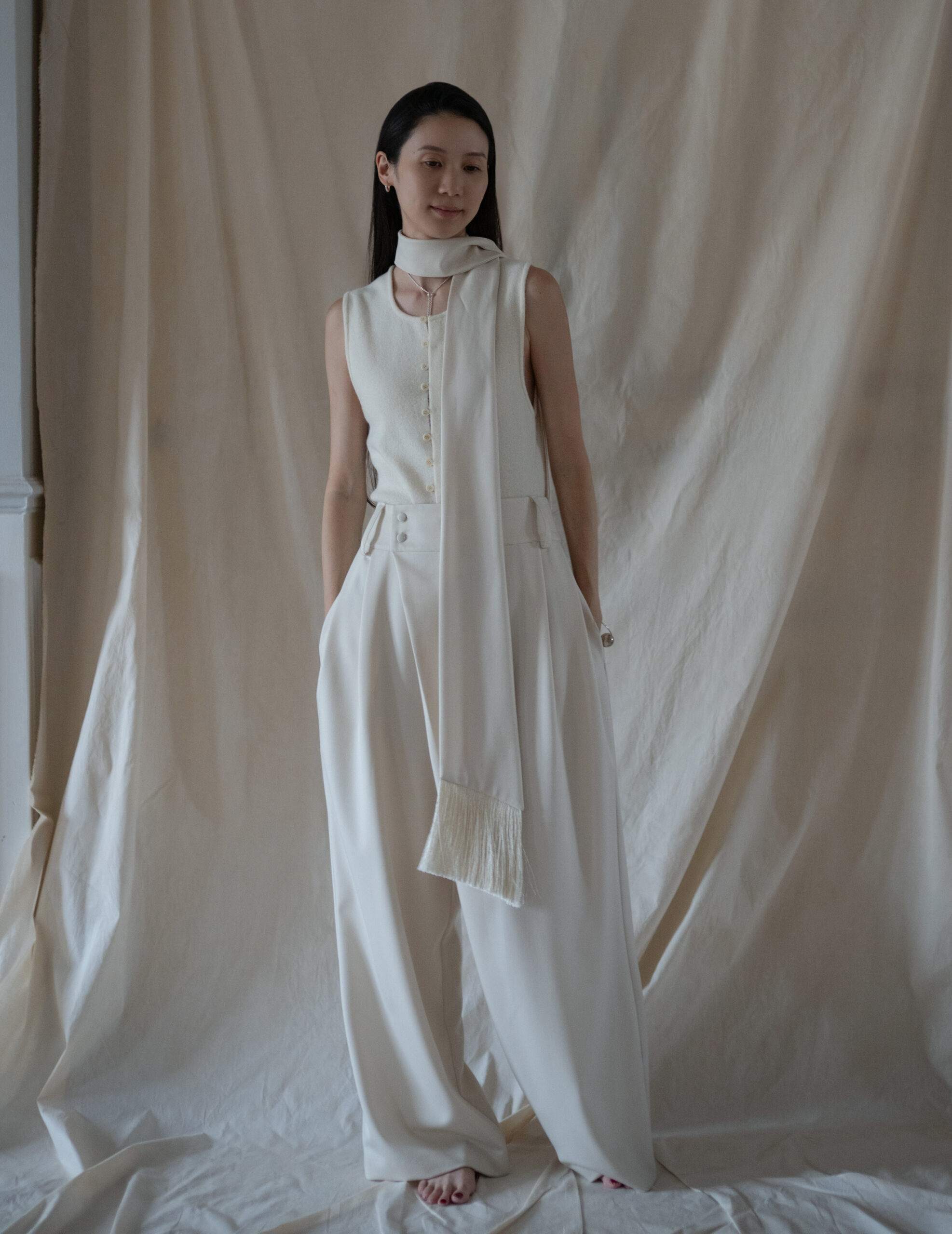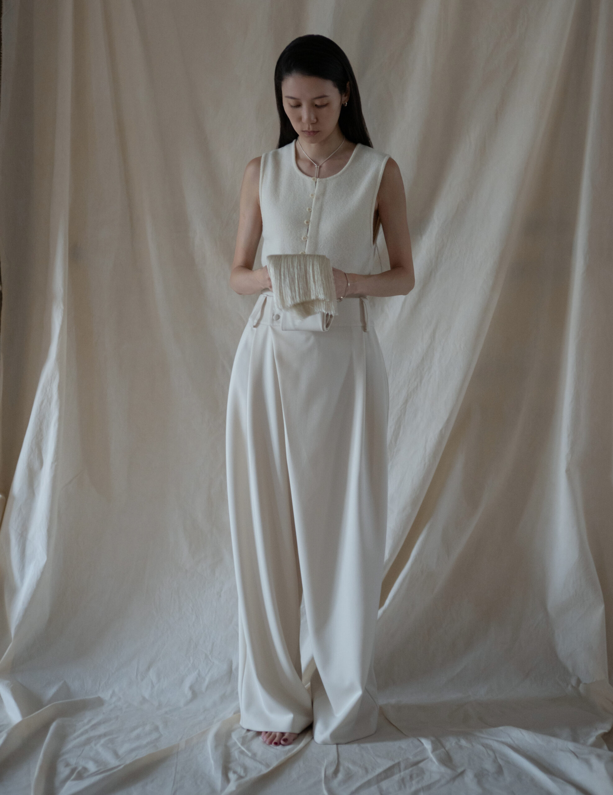 The Bahroma Pants from Ukrainian brand DELEGAN feature a voluminous wrap silhouette with a high waist, finished with a silk fringe belt.