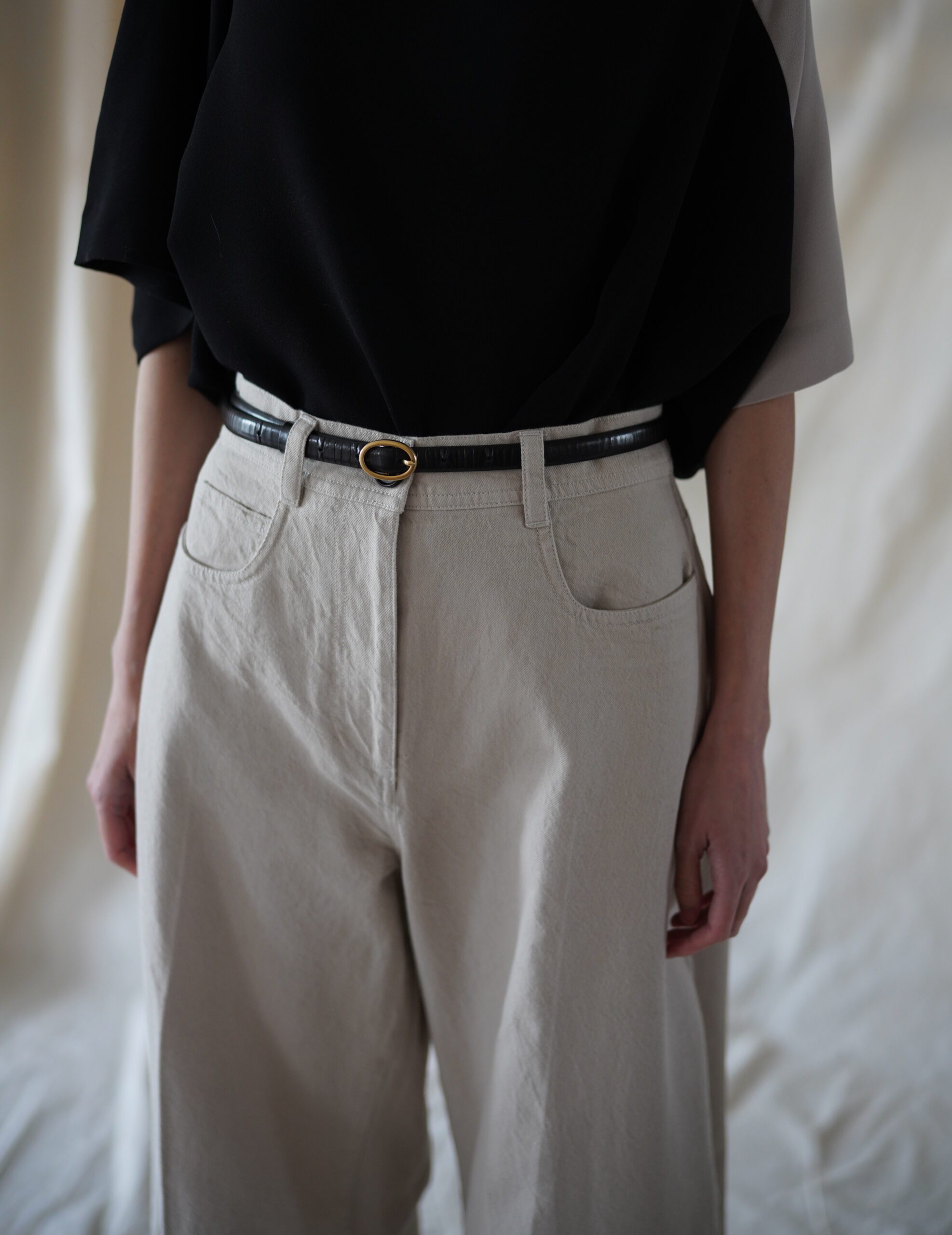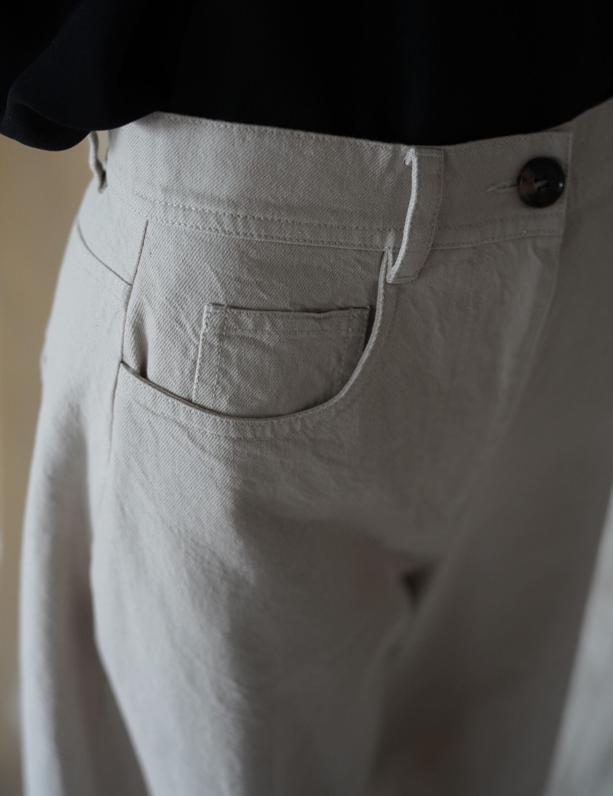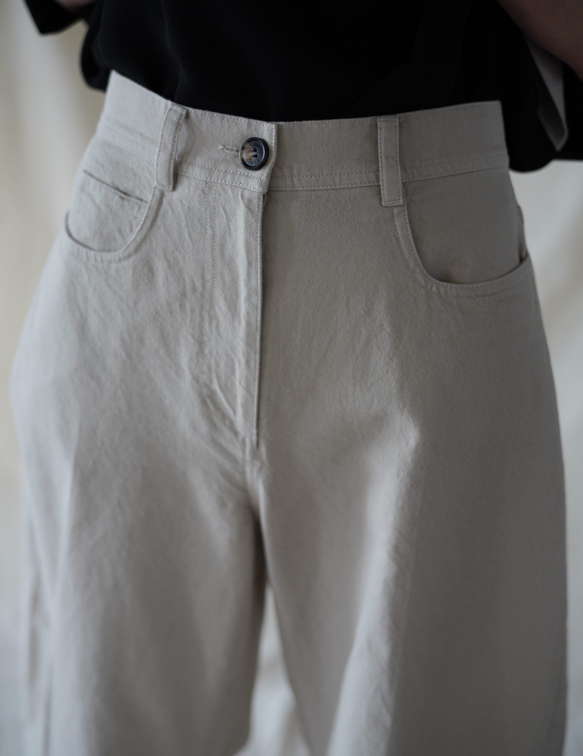 Subtle denim-inspired detailing adds depth to the minimalist design, while the cropped length enhances proportion and versatility. Easy to style with knits, shirts, or outerwear, this piece reflects MKDT Studio’s signature approach to modern, understated dressing.