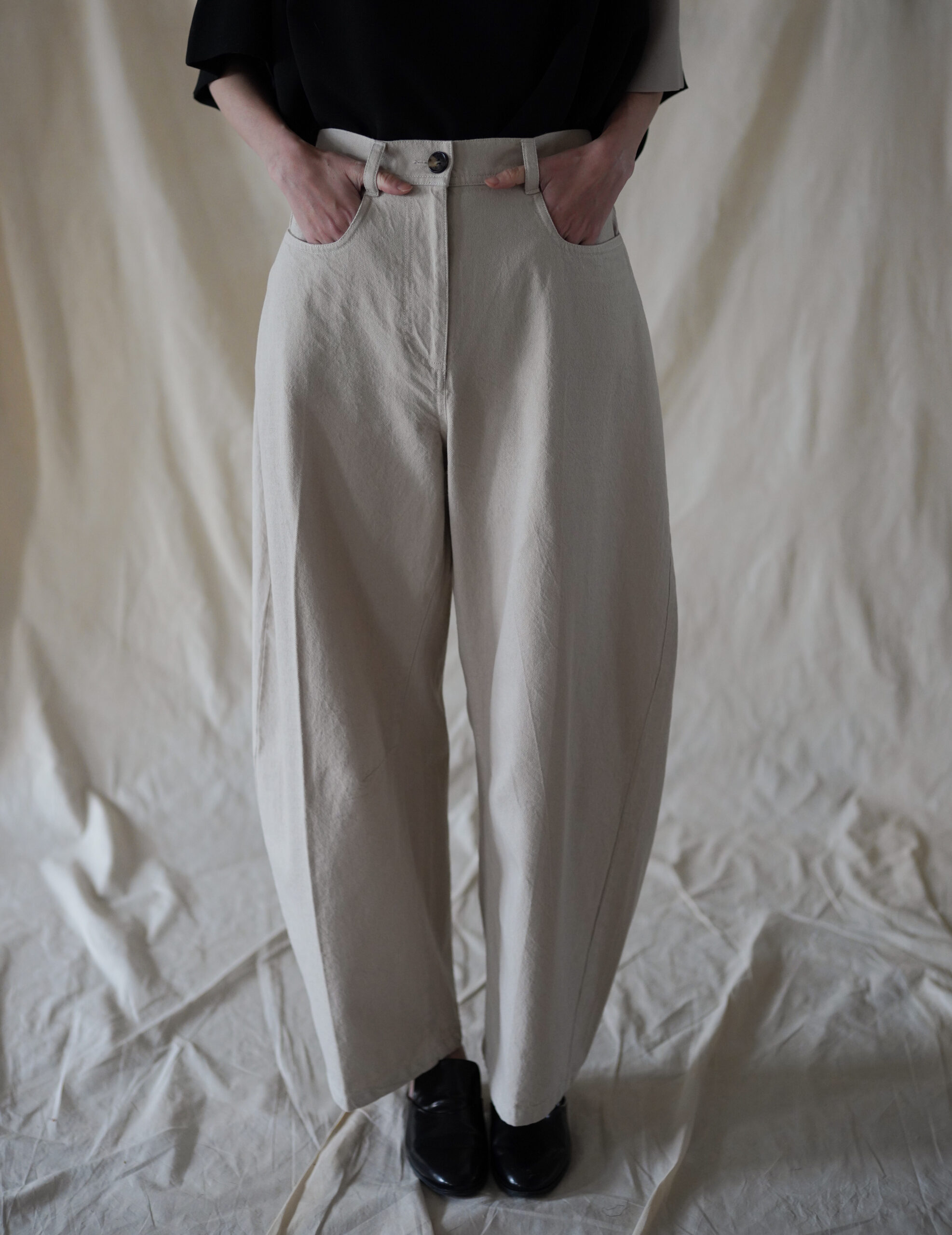The Pella pants from Danish brand MKDT Studio are crafted from 100% cotton twill, offering a refined texture with natural structure. Designed with a high waist and a relaxed barrel-leg silhouette, the pants create a softly sculpted shape that balances comfort and architectural form.