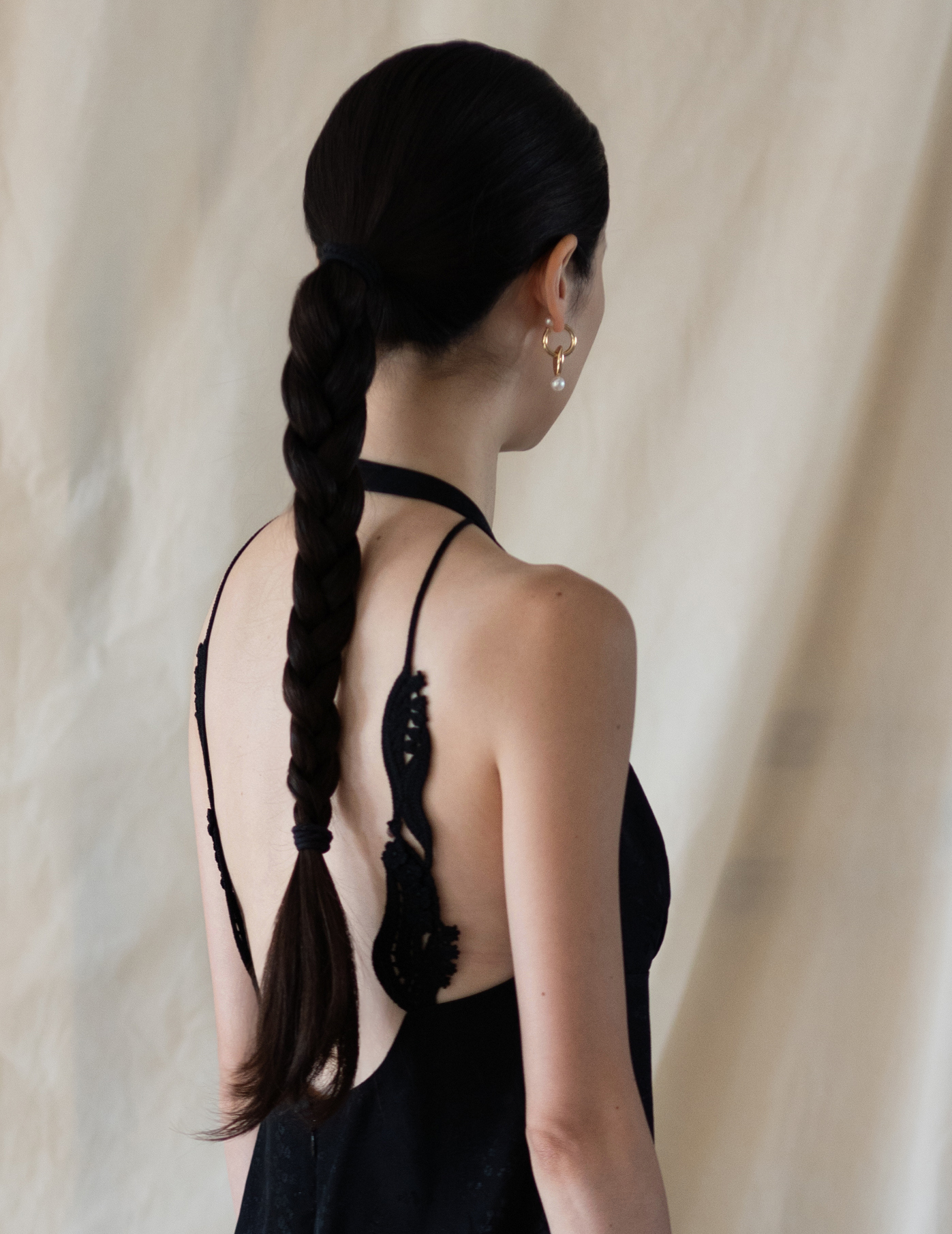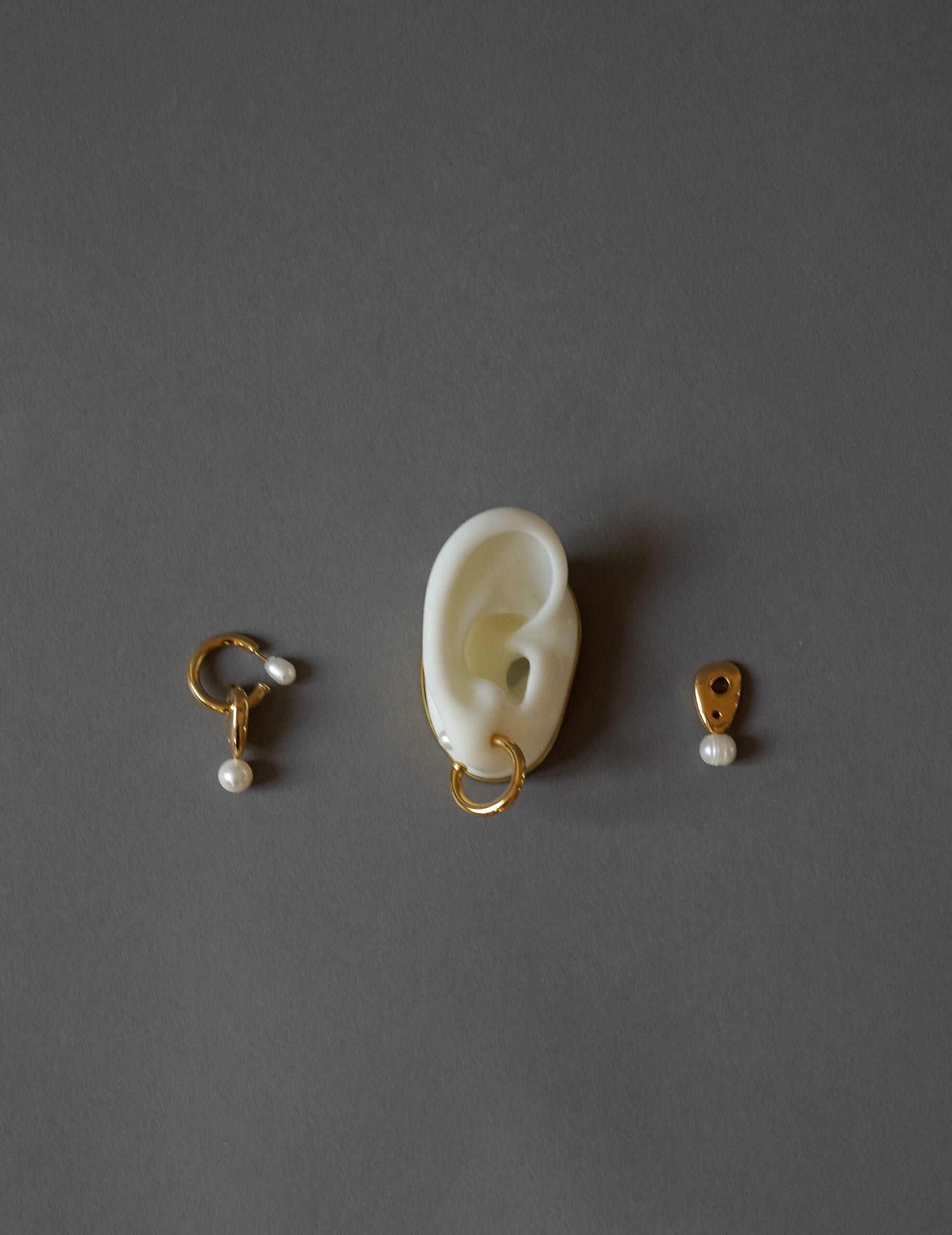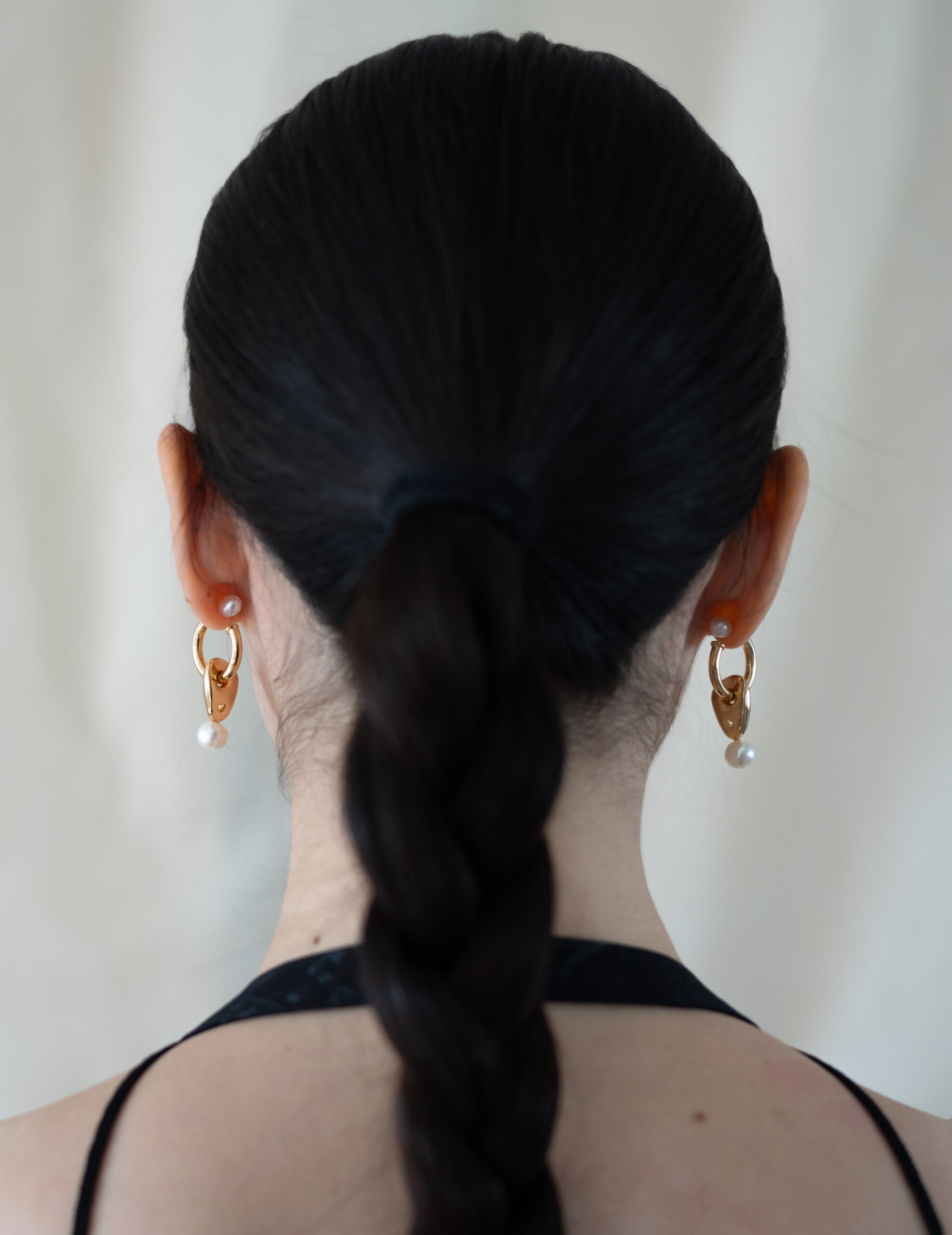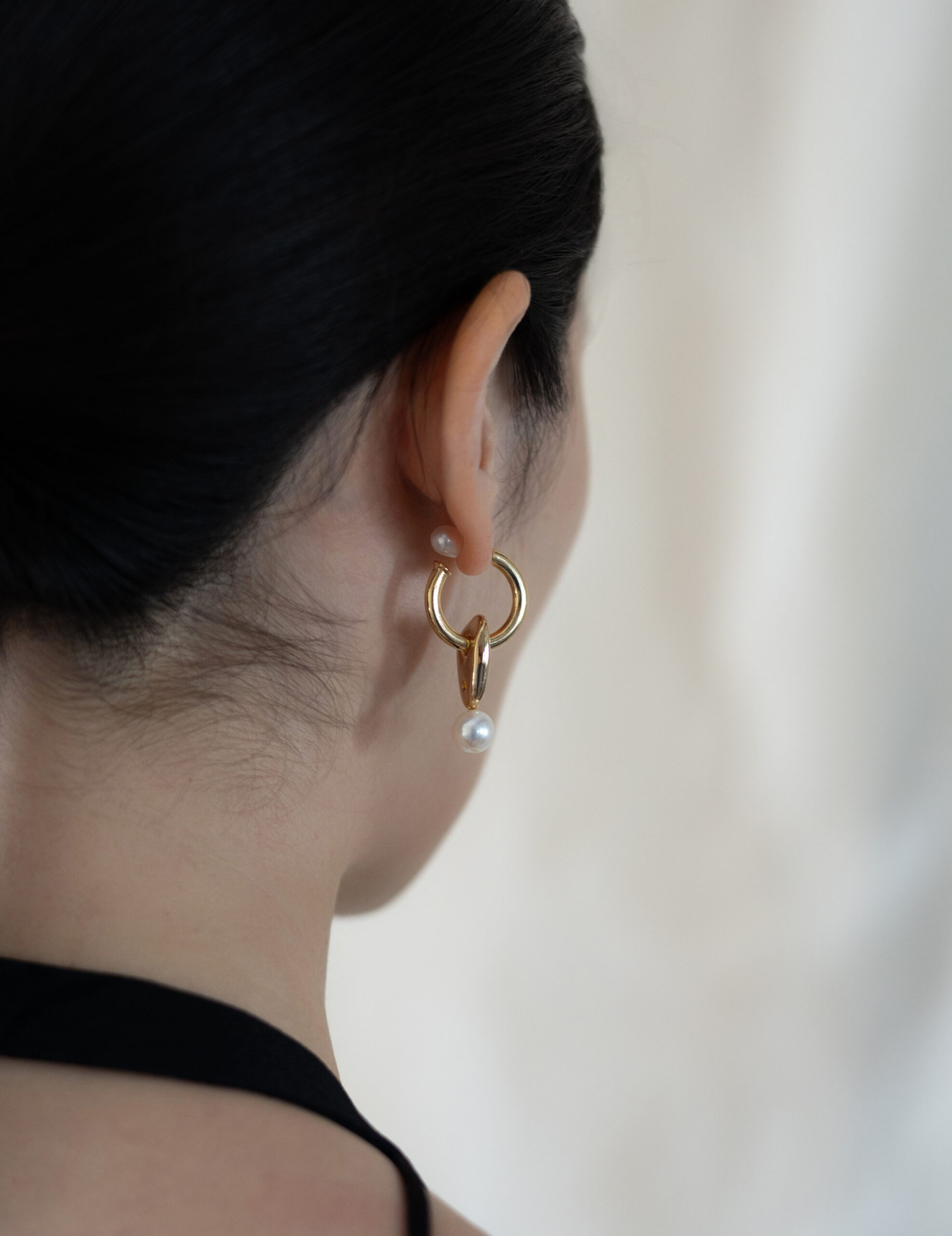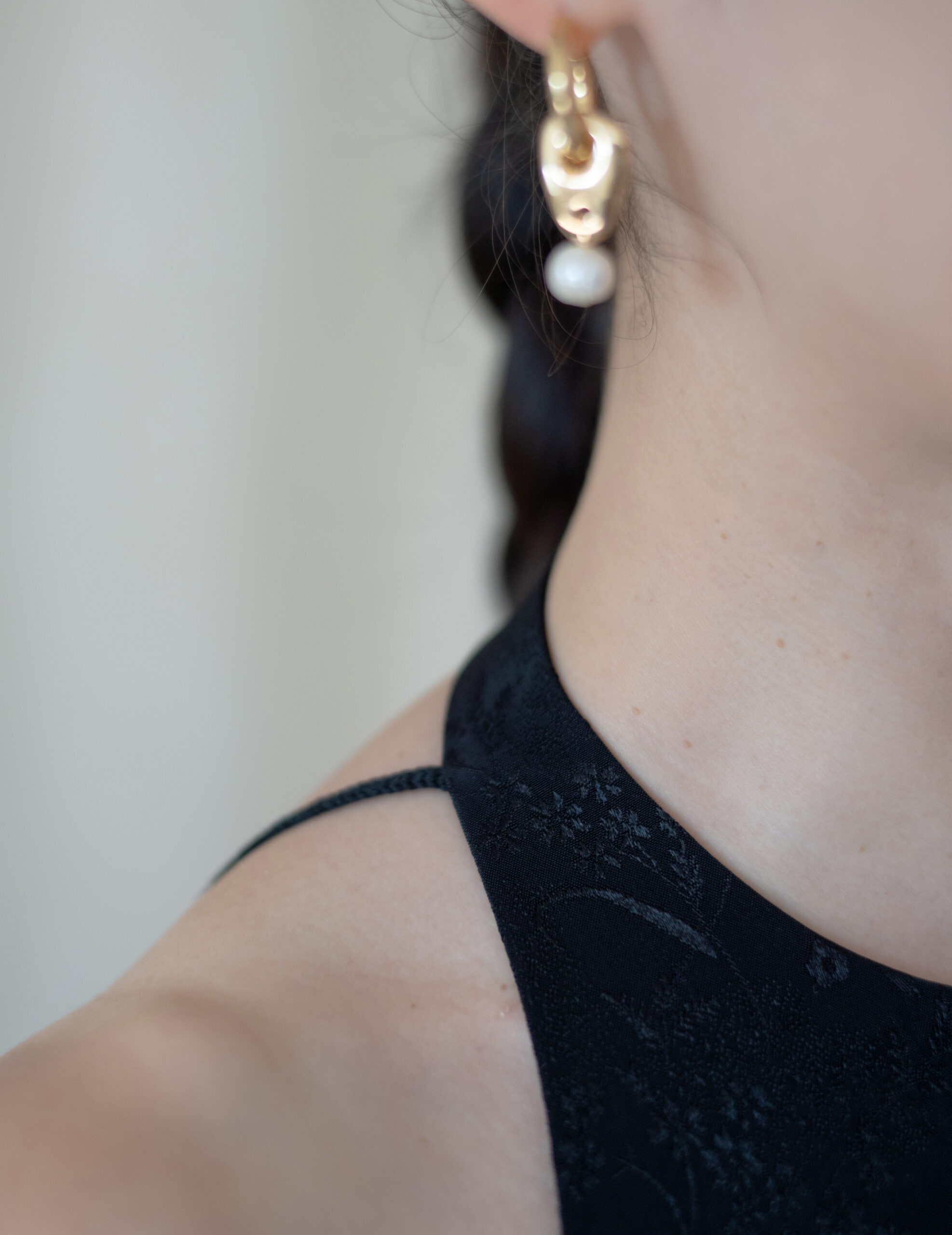 The Freshwater Pearl Earrings from Japanese designer brand Mame Kurogouchi feature natural freshwater pearls paired with brass, highlighting the organic beauty of irregular shapes. With delicate hoops connecting asymmetrical metal and pearl details, the earrings sway gracefully with light and movement, adding a subtle touch of refinement.